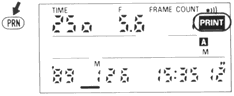 To imprint data during Interval Timer operation: Select the desired display using FNC and MOD buttons, then push PRN button so the Data Imprint set indicator appears. Releasing the shutter while PRINT is showing causes data selected in Between-Frames and/or In-Frame Data Imprint function to be imprinted, even when the function indicator does not appear and data is displayed for Interval Timer function. To take two or more shots for one shooting, set the film advance mode selector to CL. At S mode, imprinted data may be blurred.