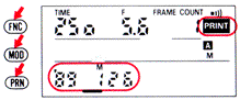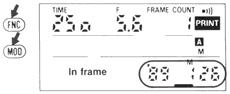 2. Select desired display using FNC and MOD buttons. Releasing the shutter while PRINT is showing causes data selected in Between-Frames and/or In-Frame Data Imprint function to be imprinted, even when the function indicator does not appear and data is displayed for other functions. If data imprint is not necessary, set to no-imprint display.