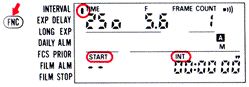 1. Push FNC button so Interval Timer Indicator appears In the LCD. START (Start Time) and INT (interval Time) also appear.