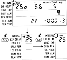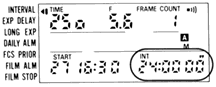 The Interval Timer function lets you take a specified number of shots at specified intervals for a selected number of shootings. The maximum interval that can be set between shootings is 99 hours 59 minutes and 59 seconds, and up to 99999 exposures can be taken at one shooting. (Because the limit of bulk film rolls is 250 frames, however, the film may have to be changed before you can complete the shooting.) The maximum number of shooting intervals at one setting is 99999. Data imprinting is possible during Interval Timer operation. * When changing film, be sure to make six blank exposures before you set (or reset) the Interval Timer.