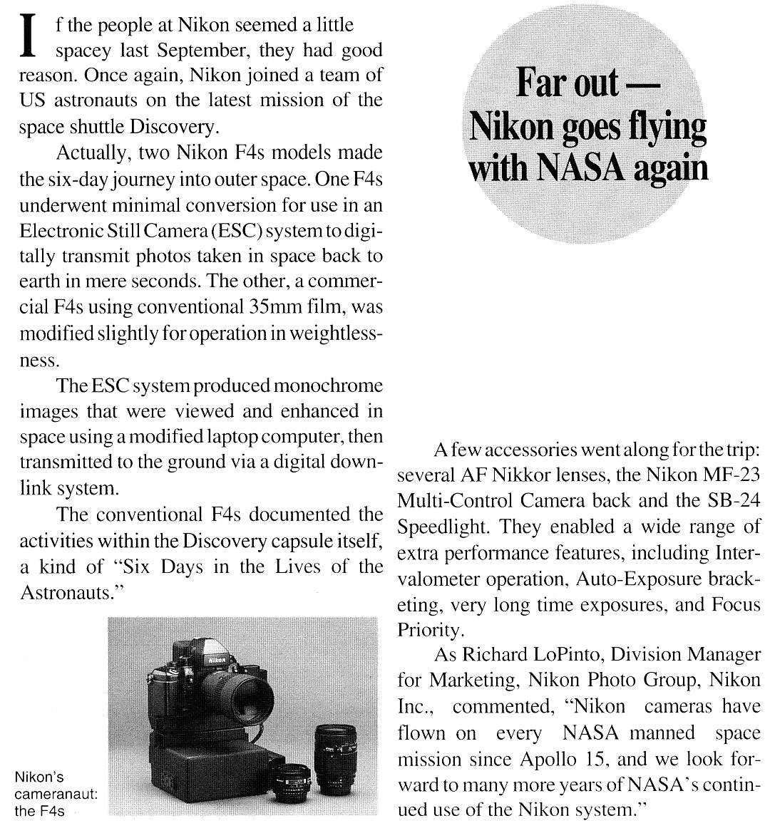 " .... If the people at Nikon seemed a little spacey last September, 1992, they had good reason. Once again, Nikon joined a team of US astronauts on the latest mission of the space shuttle Discovery. Actually, two Nikon F4s models made the six-days joumey into outer space. One F4s underwent minimal conversion for use in an Electronic Still Camera (ESC) system to digitally transmit photos taken in space back to earth in mere seconds.