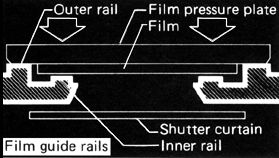 (3) A sprocket with teeth on both ends to transport the film positively through the camera. (4) A three-slotted take-up spool, which firmly grips the film leader and rotates in the opposite direction from the natural film curl for increased flatness. (5) A film roller on the inside of the camera back to guide the film from the guide rails to the sprocket.(6) An extra large film pressure plate to keep the film perfectly flat when it's over the film gate. (7) A film cassette stabilizer, which prevents the cassette from wobbling in its chamber.