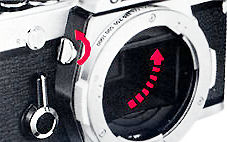To lock up the mirror, compose and focus on your subject and then turn the mirror lock-up lever counter-clockwise until it stops (approximately 90°). After shooting, always return the lockup lever to its original position. Caution: Do not carry the camera in direct sunlight with the mirror locked up. This can result in damage to the shutter curtains. Note: You can lock up them mirror before or after advancing the film.
