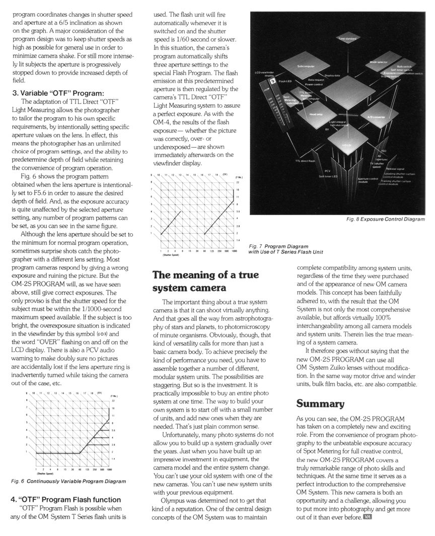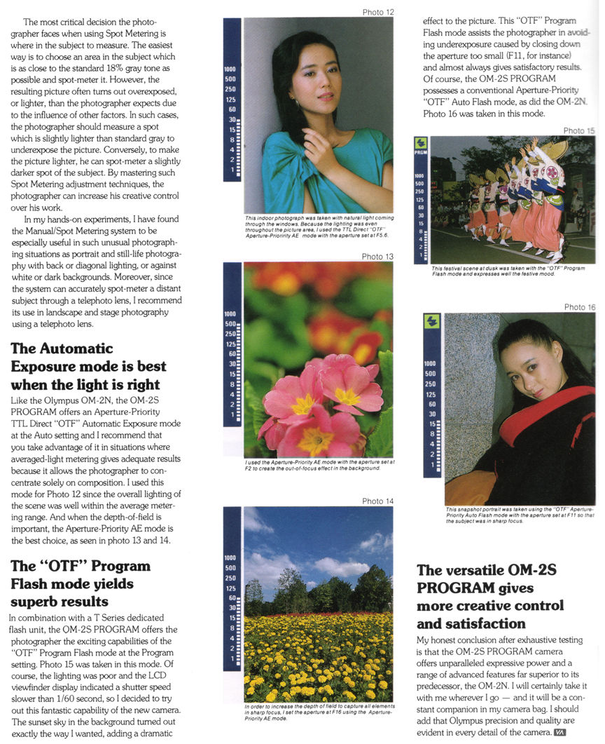 Around 1984, you could buy an OM2S in the USA for $209... at the same time I think the OM4 was over $400 and the cheaper, OM-10 based models were not far below the OM2S - The OM-PC (OM40?) might have even been higher. For comparison, I had paid $228 in 1978 for my OM1, and that was a very low discount as the Olympus OM1N was about to be introduced. At this price, the OM2S was probably the best bargain of any high quality camera in the world. It had all of the features of the OM4 except for the 1/2000 shutter speed and the "multi" spot metering system which was useful to a small minority of users ... and in addition to that, it added what was the world's best and most advanced program operation mode - the only one in the world that was 100% functional with lenses that were not designed to support shutter priority operation. I never understood why the OM2S, instead of the OM4, got the program option.... or, for that matter, why the OM2S ever existed at all: Why not just combine the program mode into the OM4 and either leave the OM2N in the line or drop it out? The fact is that neither the OM2S nor the OM4 was a great success in the marketplace, and I think it may come back to the state of the market itself. In the 1970s, I could probably name from memory all of the models that were offered by all of the significant players; but beginning with the Canon AE1, there was a mad rush to churn out more and cheaper 35mm SLRs to fuel and capitalize on a wave of interest at the bottom end of the market.In this climate, it was difficult for any one camera model to stand out as the OM1 and OM2 had, and people's expectation of price had dropped through the floor. Simply beaing an excellent camera was no longer good enough, now it had to have all the new whistles and bells, and sell for less than $200 on top of it. The ignorance of the new mass market added to the problem.... after Nikon and others introduced "multi-pattern metering", many people thought that those cameras could somehow apply a different exposure value to different areas of the image so they'd never get a picture with washed-out or dark areas in it. More useful features became lost in a sea of marketing gimmicks, and the buyers weren't smart enough to be able to tell which was which.