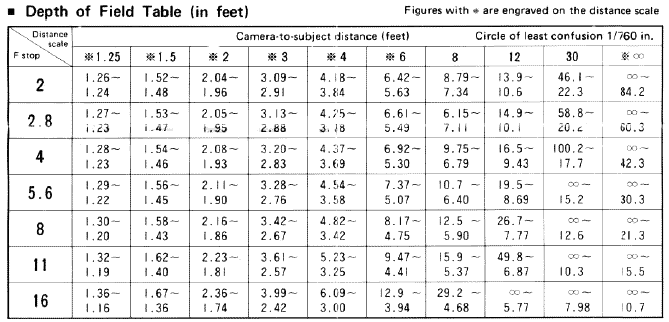 Note: When using a polarizing filter, be careful as the filter turns by moving the aperture ring. Compatible focusing screens are 1-1, 1-6, 1-10, 1-13 and 1-14. The 1-5 or 1-6 (microprism-clear field type) offers a brighter image, but the meter built into the OM-1 and OM-2 (on MANUAL) does not give correct light readings. With the OM-2 on AUTO, correct exposures are made on the film, but the meter needle does not give correct light readings. | Depth of Field Table for this lense |A Brief overview on Zuiko Optics