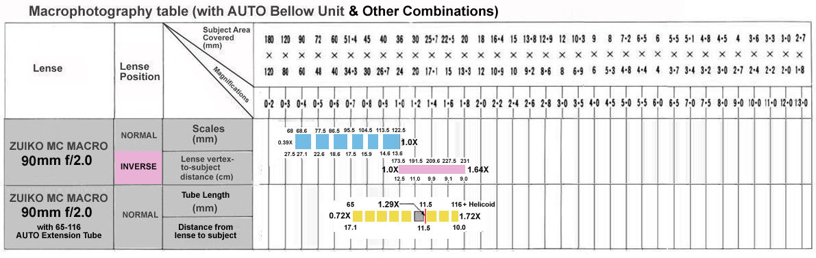 The lense is designed for optimum performance at 1/10 magnifications, it gives superb results in general purpose photography at infinity, or for macro subjects as large as 1/2 life-size. With an Auto Extension Tube 25, it extends the limitation from 1/2 to 1:1 life size (But to get best results. Olympus recommends using the alternative Zuiko 1:1 Macro 80mm f/4.0 in conjunction with Auto Bellows) and can be used for even higher magnifications with the Auto Bellows or Telescopic Auto Tube when other macro lenses are not to hand.