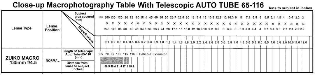 Especially when used with the telescopic 65-116, the lense permits automatic diaphragm control just as an ordinary Iense does. With the Auto Bellows. automatic aperturing is achieved by the use of the Double Cable Release. Although its maximum taking aperture is rated at a rather slow f/4.5, the lense provides f/4.0 brightness when looked through the viewfinder, making composition and focusing easier, naturally, good choice of focusing types may also be helpful for sheer comfort in viewing, focusing and picture compositions. (Olympus suggests the use of compatible focusing screens types such as 1.4, 1-10, 1.11, 1-12 and 1.13).