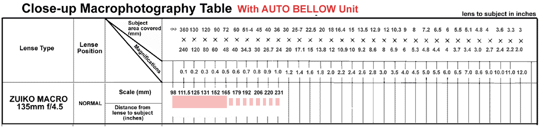 Zuiko Macro/Close focus lenses: Zuiko AUTO MACRO 20mm f/3.5 | Zuiko AUTO MACRO 20mm f/2.0 | Zuiko AUTO MACRO 38mm f/3.5 | Zuiko AUTO MACRO 38mm f/2.8 | Zuiko AUTO MACRO 50mm f/3.5 | Zuiko AUTO MACRO 50mm f/2.0 | Zuiko AUTO MACRO 1:1 80mm f/4.0 | Zuiko AUTO MACRO 90mm f/2.0 | Zuiko AUTO MACRO 135mm f/4.5