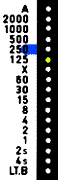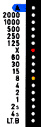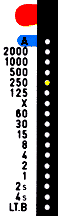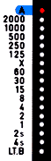 Yellow LEDs are used along the shutter speed scale between 1/15th second and 4 seconds as a slow speed warning and reminder to use a tripod or supplemental lighting, or to change the lens to a wider aperture setting.