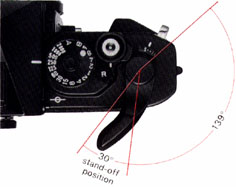 First push the advance lever out to its 30° stand-off position To advance the film, turn the advance lever all the way to the right in one continuous 139° stroke or several short ones. This also cocks the shutter and prepares the diaphragm and mirror for the next shutter release. The film must be advanced fully to the next frame or the shutter will not release.