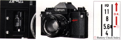 IMPORTANTThe New Canon F- 1 can be used even if the battery fails simply by removing the exhausted battery from the camera. The mechanically controlled shutter speeds are 1/2000 to 1/125 sec., "S" (1/90 sec.) and "B" (bulb).
