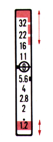The red marks next to 32, 22 and 16 in the aperture scale are overexposure warning zones. If the meter needle points to one of these zones, check the lens' minimum aperture. If, for example, the meter needle points to the red zone between f/16 and f/22 and the minimum aperture is f/16, turn the shutter dial to a faster speed until the meter needle points to an aperture of f/16 or larger.