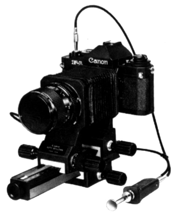 1. If you insert an accessory designed for AUTOMATIC diaphragm control, such as the Auto Bellows or Bellows FL, between the camera and ANY lens, follow the steps for stopped-down metering. 2. If you insert an accessory designed for MANUAL diaphragm control, such as M Extension Tubes or Bellows M, between the camera and a NON-FD lens, follow the steps for stopped-down metering. Turn the A-M ring of an FL lens to "M" for taking the shot (not necessary if Canon Macro Auto Ring and Double Cable Release are used). 3. If you insert in accessory designed for MANUAL diaphragm control between the camera and an FD lens, unless you use the Canon Macro Auto Ring and Double Cable Release, first set the lens for manual diaphragm control before mounting it on the accessory. Then follow the steps for stopped-down metering. Note