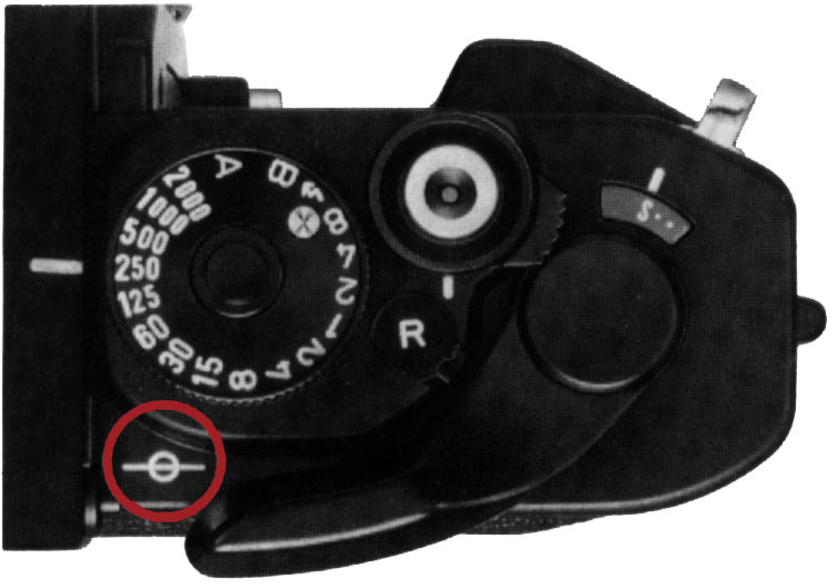 This mark, engraved on top of,-the camera body, indicates the exact position of the film plane. It is useful for measuring the exact shooting distance from film to subject in closeup photography. Distances on the lens' distance scale are calibrated from this mark. It is not used in general photography.