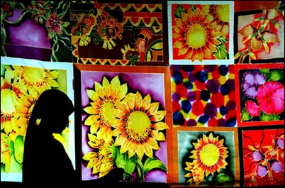 A woman is silhouetted as she designs a hand-painted Malaysian batik.