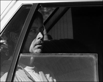 David Hamilton, a serial killer, sits in a police car while waiting for police divers looking for bodies of his wife and daughter which he dumped in a river after killing them near Knoxville, Tennessee, in summer 1990.
