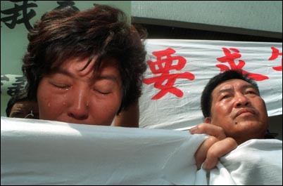 is in tears while others holding banners during a demonstration in Kuala Lumpur May
