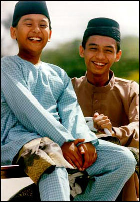 Farhan Khairi (L) and Syamsul Bahri Muhammad pose for Eid al-Fitr photo in Kota Bharu, Malaysia. Moslems around the world celebrate the annual festivities on the first of Syawal according to Islamic calendar, after a month of fasting Ramadan.