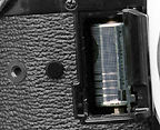 . Open the battery chamber cover using the viewfinder cover. Load a new battery so that its terminals are in the directions indicated by the diagram inside the battery chamber. Insert the negative end first. Then push down and insert the positive end. Close the chamber cover.