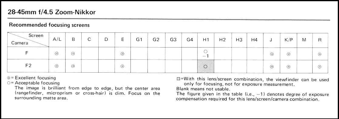 <<<--- Click for an enlarged view (23k Gif file) optical construction of the non-Ai version of this zoom Nikkor lense. Recommended focusing screen types for use with Nikon F/F2 series SLRs: